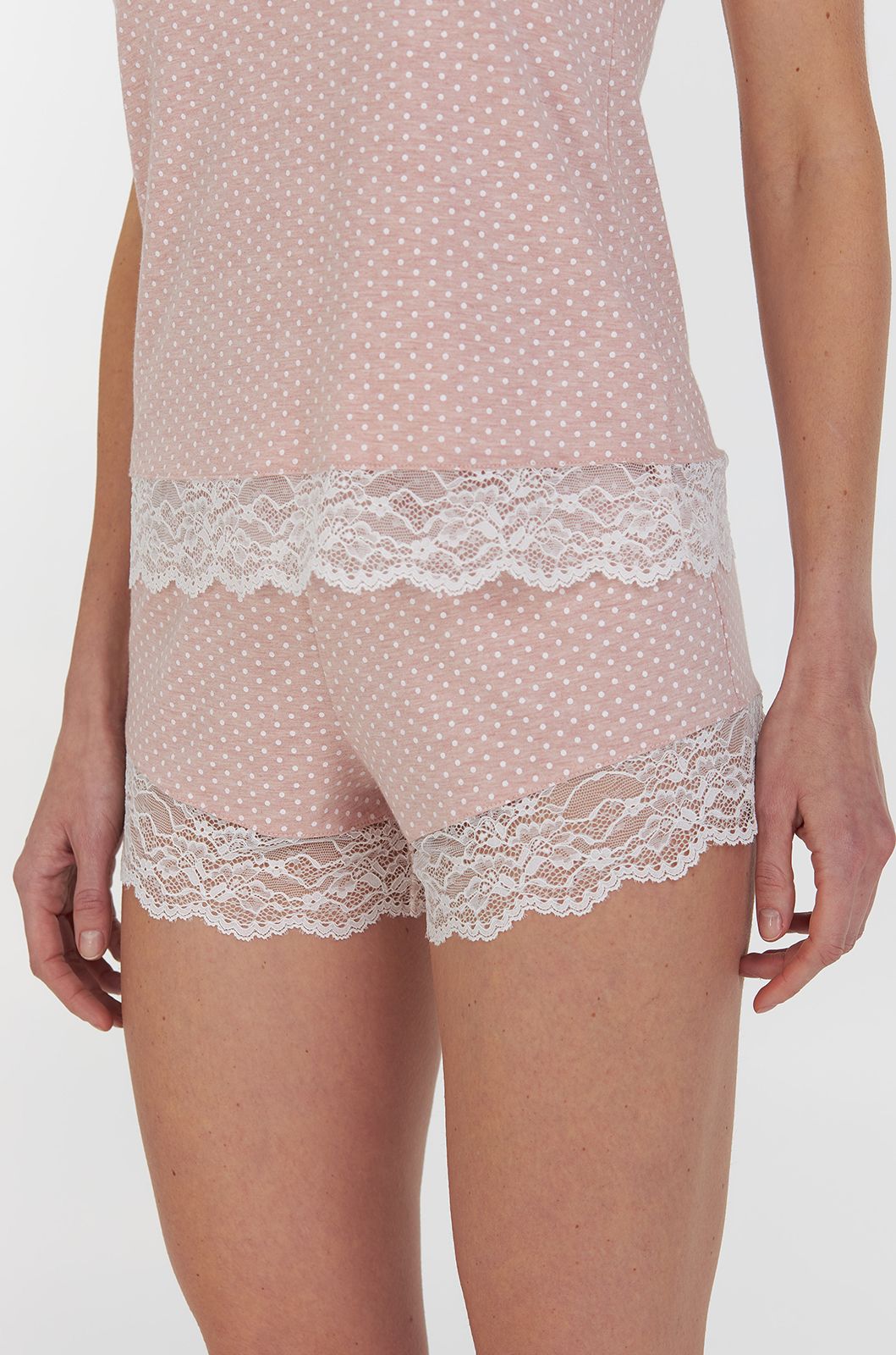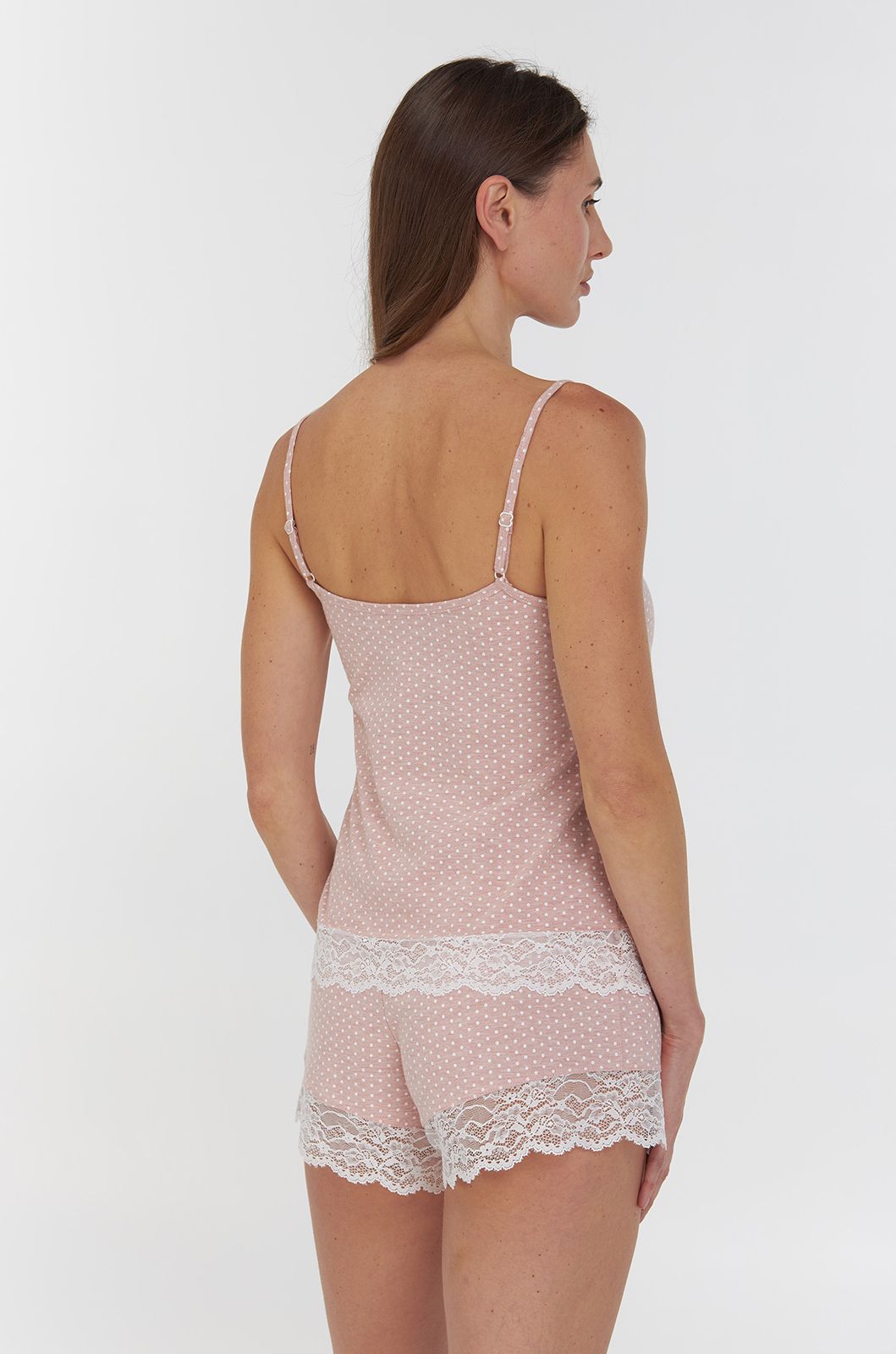 Модель виконана з натуральної бавовни (95%) з додаванням еластану (5%), що робить тканину приємною на дотик, еластичною та стійкою до зношування. Ніжний персиковий колір з дрібним білим принтом у вигляді краплинок надає образу жіночності й свіжості.